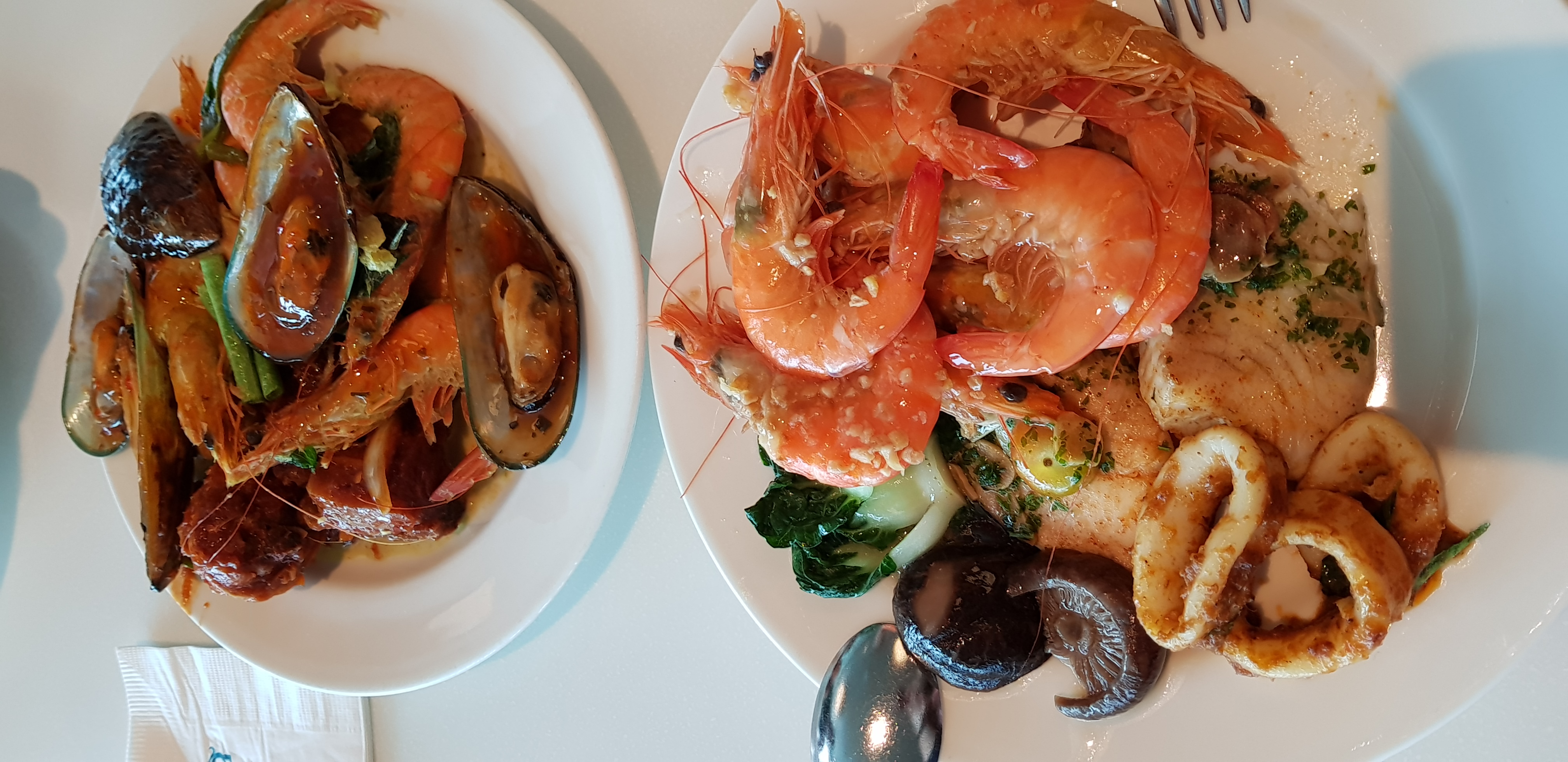 For our first dinner and lunch on board, we dined at the Lido. There was a wide variety of food but personally, I find the halal section which serves an array of seafood the most appetising. They had crabs, prawns, clams and curry fish head. I love prawns!