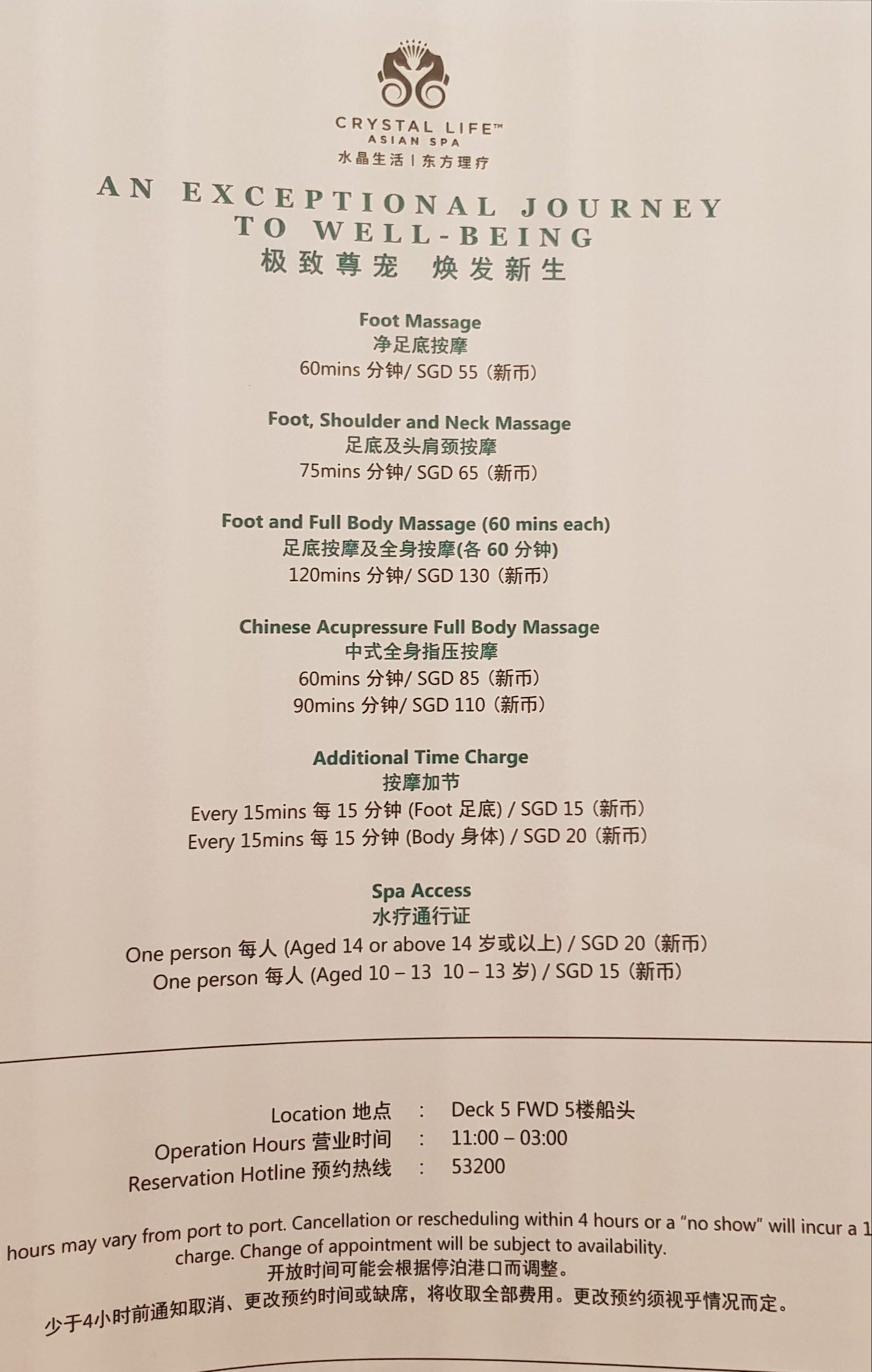 Frankly speaking, although there were many activities on board, we spent most of our time eating our (five) meals and chilling at the bar. Probably as we didn’t want to spend any extra money pampering ourselves in the spa and salon. We wanted to go for the karaoke session but there was no option for 2 pax unless we spent SGD88 for a 2 hour session.
